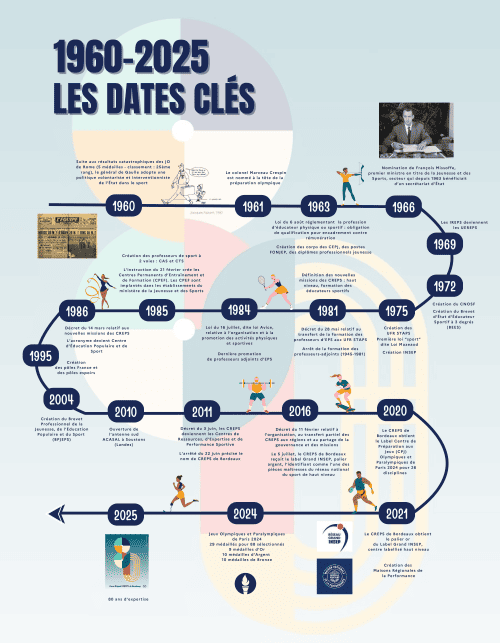 Composée de 11 panneaux thématiques, l’exposition revient sur les grandes étapes qui ont façonné le CREPS : de sa création et de ses premières missions au lendemain de la Seconde Guerre mondiale, à l’évolution de celles-ci à travers l’histoire des départements Formation et Haut Niveau.